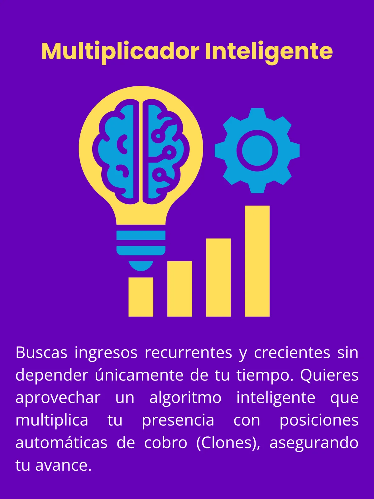 En ProsperNet, eliminamos la soledad financiera. Tu avance no depende únicamente de tu esfuerzo de reclutamiento. Recibirás apoyo constante de la comunidad y de tu línea ascendente. Además, el sistema genera Clones Inteligentes (posiciones de cobro automáticas) que multiplican tu potencial de ganancia, asegurando el avance colectivo.