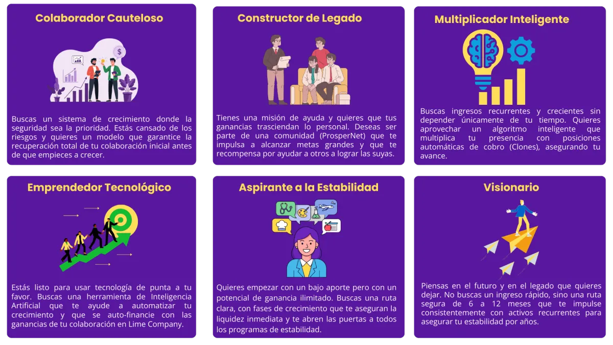 Mi misión es ayudar a familias y profesionales a generar ingresos recurrentes sin necesidad de poner en riesgo sus ahorros, a través del modelo seguro de colaboración de Lime Company.